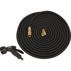Sealey Ø17mm Expandable Garden Hose Black 30m Premium Features: Expandable hose can reach distances of up to 30m, yet can still be stored away with ease. Latex material increases the strength and durability of the garden hose. Weave design prevents tears when under tension. Supplied with brass fittings that can stop the build-up of rust, and stop the hose from cracking, leaking or corroding. Spray nozzle features comfortable trigger and handle as well as ten different settings to suit a variety of tasks. Suitable for watering, gardening, pool cleaning, vehicle cleaning and much more. Technical Details: • Expandable hose can reach distances of up to 30m yet can still be stored away with ease. • Latex material increases the strength and durability of the garden hose. Weave design prevents tears when under tension. • Supplied with brass fittings that can stop the build-up of rust, and stop the hose from cracking, leaking or corroding. • Spray nozzle features comfortable trigger and