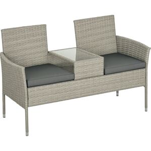 This Outsunny double rattan wicker chair combines two chairs and a coffee table into a single unit a place to sit and relax outdoors with your favourite person. Look to the middle table for a handy holding place, complete with a sleek tempered glass top. Specifications: ● Colour: Mixed Grey, Grey ● Material: PE Rattan, Steel, Glass, Polyester ● Overall Dimension: 137W x 59D x 82H cm ● Seat Size: 45W x 47D x 42H cm ● Back Size: 45W x 44H cm ● Tabletop Size: 25.5W x 45.5D cm ● Bottom Shelf Size: 30W x 45D x 15H cm ● Weight Capacity (Per Seat ): 120 kg ● Item Label: 867-181V01GG Features: ● Combines two chairs and middle table ● Steel frame wrapped in stylish rattan ● Tempered glass-top table, with bottom shelf ● Cushions for comfort, with removable and washable covers ● Assembly required