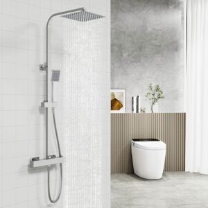 Square Exposed Thermostatic Shower Information: Key Features 200mm square slim shower head with adjustable swivel so it can be tilted to adjust the water spray and for ease of use Superior build quality and finish Highly polished mirror chrome finish for a silky touch surface with a mirror-like shine Resistant to rust and corrosion Built-in safety device against scalding Easy-to-clean rubber nozzles on both top and handheld unit 1.5m flexible stainless steel shower hose Square thermostatic mixing valve, durable and solid brass construction The height-adjustable lifting rod (800mm - 1200mm) lets you slide the handheld showerhead up or down to the right height. Technical Information: Pipe Centres: 150mm +/- 15mm Inlet Connection Size: G3/4" and G1/2" Minimum Bar Pressure: 0.05 Bar Maximum Bar Pressure: 0.5 Bar Tube Diameter: 29mm / 25mm Shower Hose Length: 1500mm Shower Arm Length: 311mm Shower Top to Bottom Adjustability: 800mm - 1200mm Package contents: 1 x thermostatic valve 1 x