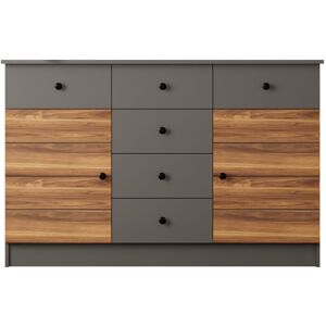 (Unique blend of country and modern furniture DAISY range represents simple and timeless design features. Finished in white and gunmetal black accessories.Features: 2 Doors 6 Drawers Material: MDF Colour: Walnut&Anthracite Dimensions: Width:130cm Height:87cm Depth:43cm Arrives flat packed Assembly required)