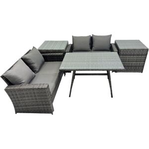 Unwind in luxurious comfort! This cushioned PE rattan sofa set provides exceptional support, while its weatherproof construction guarantees long-lasting beauty in your garden or balcony. Set Dimensions: • 2 x Side Table Size: 65L x 65W x 66H cm • 1 x Dining table size: 110L x 70W x 70H cm • 2 x 2 Seater sofas size: 124L x 70W x 74H CM Dark grey mixed rattan with dark grey fabric .Color may some difference due to light or monitor .we are unable to return the item due to color problem. Items Comes Flat Packed And Easy Assemble,Sturdy Galvanized Steel Tube Metal Frames With Powder Coating To Prevent The Rust Flat PE Rattan Completely Made By Hand, 5mm Thickness transparent Tempered Glass With Sucker On Surface To Prevent Sliding Low Maintenance ,Removable Cushion Cover And Easy Move To Different Place.Pls Keep the Cushion Indoor Or put on With Rain Cover When Not In Use . Keep The Furniture With Rain Cover If Not Use For Long Time . 8 CM Thick Seat Cushion With Soft Pillow Back Cushion