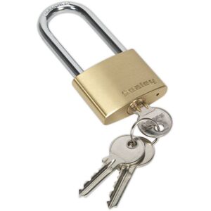 Sealey Brass Body Padlock Long Shackle 50mm Features: Key operated padlock with corrosion resistant brass body and hardened steel long shackle. Featuring precision 5-pin tumbler locking mechanism. Supplied with three keys. Technical Details: • Key operated padlock with corrosion resistant brass body and hardened steel long shackle. • Featuring precision 5-pin tumbler locking mechanism. • Supplied with three keys. • Shackle Diameter: Ø8mm. • Shackle Max. Internal Height: 55mm. • Shackle Max. Internal Width: 26mm. • Security Rating: 2. • Model No. PL102L • Model No. PL102L Additional Information: • Key operated padlock with corrosion resistant brass body and hardened steel long shackle. • Featuring precision 5-pin tumbler locking mechanism. • Supplied with three keys. • Shackle Diameter: Ø8mm. • Shackle Max. Internal Height: 55mm. • Shackle Max. Internal Width: 26mm. • Security Rating: 2.