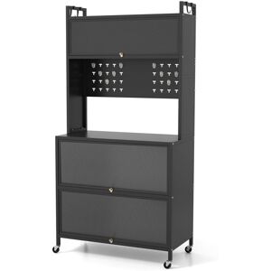 Features:Ample storage space with 3 large shelves and a wide countertopConvenient flip door design for both visibility and protectionEasy to flip up the door with the convenient handle and magnetic catchBack panel can be detached for easy electric accessSturdy and durable with heavy-duty metal structureAnti-toppling device makes the bakers rack stand stablyProtective corners for higher securityEquipped with 4 universal wheels, 2 of which are lockableFolding main frame save space for storageAssembly requires less effort and time Costway 4-Tier Kitchen Bakers Rack Metal Microwave Stand Spacious Kitchen Storage Shelf in White