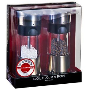 As the name suggests, the Cole & Mason Horsham Inverta Salt & Pepper Mill Gift Set sits 'upside-down' on the table to keep things nice and tidy. The modern design and chrome and acrylic materials give these mills a contemporary styling that will look good in any kitchen or dining room. The pepper mill has five grind settings and the salt mill has three grind settings. The high quality grind mechanisms (carbon steel in the pepper mill, ceramic in the salt mill) come with a lifetime guarantee.