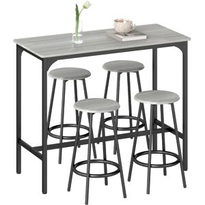 An industrial touch, compact in size: say hello to this HOMCOM breakfast bar table and stools set. Five pieces, formed of a tall table and four matching stools—room for relaxing with family or friends. Metal frames ensure a strong, supportive structure, with MDF tops; the industrial-style colouring is striking, a unique addition to your kitchen and dining space. Bar table and stools are complete with handy adjustable feet.- Five-piece set: tall table and four round stools; - Striking and bold industrial-style design: a strong piece for your kitchen and dining areas; - Stools tuck under table to save space. Won't get in the way; - Strong and supportive steel frames, with handy adjustable feet; - Maximum load: Table 50kg. Stool 120kg. Assembly required;- Colour: Rustic Brown, Black; - Material: MDF, Metal; - Table Dimensions: 110L x 50W x 89.5Hcm; - Stool Dimensions: Ф30 x 60.5Hcm; - Footrest Height: 22cm (table), 17cm (stool); - Weight Capacity: 50kg (table), 120kg (stool); - Item Label: 835-890V00RB; HOMCOM Colour: Grey