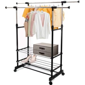 Multi-functional Clothes Rack Double Rods for space-saving & more clothes 4 Castor Wheels for quick & easy movement High-Grade Steel construction with PP joint. Strong and durable. Easy to Assemble, No tools required. Specification: Material: Stainless steel Sub-Type: Clothes Rail Extensible Length: 32.6-57" / 83-145cm Extensible Height: 37.4-63" / 95-160cm1 Width: 31.5" / 80cm Max Load: 20kg Main Colour: Black Features: Adjustable, With Wheels Package Included: 1x Cloth Rack