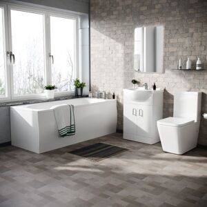Description Included in this set is the stunning 550 mm white gloss freestanding basin top vanity unit comes complete with a high-quality ultra-stylish basin. Engineered with everyday use in mind, providing a storage solution for your bathroom, our Basin Vanity Unit gives you the best of both worlds, combining incredible durability and a beautiful gloss finish. Also included is this standard round bathtub is practical and stylish - a simple, clean design is perfect for a minimalist bathroom suite. The bathroom suite just wouldn't be complete without this stunning back to wall WC toilet pan and the seat with its ultra-modern designer shape. Mixing with subtle curves and clear cut direct lines, this toilet is made from white vitreous china, covered with a high gloss finish which makes the toilet stand out. Key Features Vanity Cabinet Finishing: White Gloss Effect Basin Material: Ceramic With One Tap Hole & Waste Handle Material: Polished Chrome Stainless Steel Supplied fully assembled