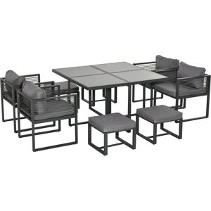 Create a go-to dining space in the garden with this Outsunny set. Aluminium frames mean a strong core, which supports you fully. The tempered glass on the tables adds a sleek look, whilst providing a safe and solid dining surface. With four armchairs and four footstools, there is space for up to nine people all seats with cushions for comfort. Specifications: ● Colour: Grey ● Material: Aluminum, Polyester, Tempered Glass ● Table Dimension: 126L x 126W x 72Hcm ● Chair Dimension: 60W x 60D x 66.5Hcm ● Footstool Dimension: 45W x 45D x 30Hcm ● Chair Seat Dimension (without cushion): 58D x 52W x 42Hcm ● Backrest Height: 28cm ● Chair Seat Cushion Dimension: 52W x 52D x 5Tcm ● Footstool Cushion Dimension: 45W x 45D x 5Tcm ● Back Cushion Dimension: 52W x 30Dcm ● Weight Capacity: (chair) 160kg, (footstool) 110kg, (table) 70kg ● Item Label: 84B-657 Just so you know: this item ships and arrives in separate boxes. Delivery times may vary with each box. Box quantity: 3 Features: ● Nine-piece set
