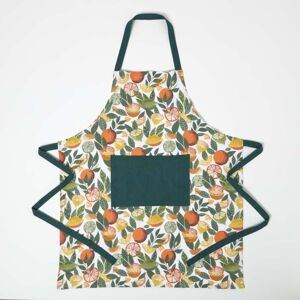 Specifications: Brand: Homescapes Size Available: W70 x H85 cm Colour: Yellow, Orange, Green Material: 100% Cotton Care Instructions: Hand wash only. Do not bleach. Do not dry clean Add a zesty splash of colour to your kitchen with Homescapes’ citrus-print cotton chefs apron, featuring lemons, limes, and oranges. This fresh, fruit-inspired design brings a vibrant and cheerful touch to any kitchen, this baking apron is perfect for those who love bright and lively vibes. Complete the look with our matching tea towels and oven gloves for a stylish, coordinated kitchen aesthetic. Crafted from 100% pure cotton, this super-soft, comfortable and breathable cooking apron ensures long-lasting comfort and durability for everyday use. Designed with a deep front pocket for convenience and a secure strap to offer a customisable fit for both men and women. Ideal for cooking, baking, BBQs, gardening, or cleaning, this versatile chef apron is machine washable at 40°C, maintaining its quality,