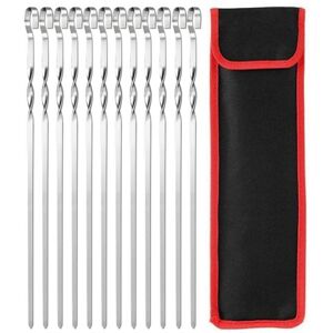 [Practical Metal Skewers] The 13-piece skewer set includes 12 skewers and 1 practical storage bag. [High Quality and ] Made of stainless steel which is safe for all kinds of food, Sturdy enough to put more food on the skewer without bending or twisting, Rustproof and for long-term use. [Angled Tip and Flat Skewer] The angled pointed tip is easy to add through pieces of meat, seafood, vegetables into metal sticks, unlike round skewers, flat skewers hold food in place so you can turn the skewer to cook evenly on all sides, also flat skewers are easy to clean and dishwasher safe. [Long and Twisted] The skewers fit different sized grills, Long enough to fit the grill pan and handle that stick out, With a twisted design in the tail that can keep your hands away from the heat source and the round shape is easy to [Wide Application & Reusable] Suitable for indoor grilling, outdoor BBQ, family dinner and more occasions, compare with wooden skewers, metal skewers can be reusable and continue