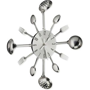 With this cutlery clock, you get an unusual eye-catcher on your wall and always keep an eye on the time. The original dinner clock is equipped with a minute and hour hand in the shape of a small fork and a knife. The full hours are marked by spoons, ladles and forks arranged around the clock face. Especially in the kitchen and dining room, the clock is a great wall decoration, but it also becomes a modern eye-catcher in the restaurant. Wall clock in detail - Diameter: approx. 40 cm- Depth: approx. 4 cm- Weight: approx. 230 g- Material: Metal, plastic- Colour: Silver Original kitchen clock for the wall - Spoons, forks and ladles mark the full hours- With knife and fork as minute and hour hands- Ideal for kitchen, dining room, restaurant etc.- With audible ticking sound- Requires one AA battery (not included) Included in delivery - 1x kitchen wall clock- Decorative items and batteries are not included