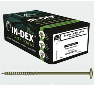 Features TIMco In-Dex Timber framing screws are an alternative to traditional coach screws, and are designed for decking, roofing, fencing, railway sleepers, and many other structural building and landscaping applications. The 8mm hex head with a fixed washer provides excellent clamping in all wood types. They have a 50-degree deep single thread to provide a fast & secure fixing with high pull-out resistance and a type 17 slash to reduce insertion torque and the likelihood of the timber splitting when inserted. They also have a 25-degree sharp point for easier penetration into all wood types. These timber screws have an organic olive green plating, which is tested to 1,000 hours (minimum) salt spray resistance. Specification Gauge - 6.7mm (widest part of thread) Length - 125mm (from underneath head) Head - 8mm hexagon head Plating – organic green