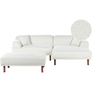 Upholstered L-Shaped Minimialistic Style Sofa with Ottoman. This modern corner sofa features a sleek, low-profile design with plush upholstered seats, offering both comfort and style for any home. Its luxurious bouclé upholstery adds texture, creating a cosy and inviting atmosphere in any space. Supported by sturdy wooden legs, its simple elegance complements any living room perfectly. With the included ottoman and the help of bottom connectors, you can create a wide, comfortable surface for sleeping. Combining practicality with contemporary charm, the sofa makes an ideal centrepiece for your living space. Details: Product Type: Corner Sofa Style: Modern General Color: White, Brown Shade: Taupe Material Type: Fabric Main Material: Boucle Additional Material: Rubberwood Filling Material: Foam Material Composition: 100% Polyester Shape: L-Shaped Arm Style: Track Orientation: Left Hand Seat Construction: Elastic Belt Seat Foam Density: 28 kg/m3 Seats Up To: 3 People Sleeper Function: Yes