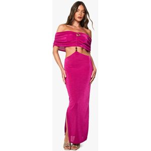 Striking Bardot neckline with elegant ruched detailing Daring cut-out design with decorative ring accent Figure-flattering maxi length with side split for movement Slinky acetate fabric that drapes beautifully against the body Two-piece effect design combining sophistication with contemporary edge Make a dramatic entrance in this head-turning Beaded Bardot Maxi Dress from Boohoo. The show-stopping design features an off-shoulder neckline with luxurious ruching and a statement cut-out detail adorned with a metallic ring accent. The slinky fabric creates a gorgeous silhouette that moves with you, whilst the maxi length with side split adds a touch of allure. Style as seen with metallic strappy heels and a compact clutch for an unforgettable night out look. For cooler evenings, layer with a cropped faux fur jacket. This versatile piece transitions effortlessly from cocktail parties to club nights, ensuring you stand out for all the right reasons whilst maintaining that perfect balance of glamour and contemporary style that Boohoo is known for.