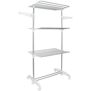 This 3-tier folding clothes airer drying rack, manufactured from high-quality stainless steel and durable plastic this item is sturdy yet light enough to move around on the castor wheels provided. Each castor is fitted with a brake to stop the rail from moving around when locked. With a fantastic drying space of up to 20 meters, you will easily fit mountains of washing on this drying rack, which holds in total up to 15kg of washing. With the clever addition of a shoe rack, the bottom holds up to 4 pairs of shoes for drying or storage. clothes airer can be folded to almost completely flat, and side wings, feet, and racks all fold in for storage. perfect for storage in a confined space. Removable side hangers simply clip off, and when not required simply unclip them. Side hangers can also be adjusted to different heights to suit items of clothing being dried, they are fantastic for hanging shirts, jackets, etc. Rebrilliant