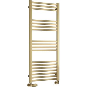 The stunning Ottone ladder rail from Reina is supplied in a brushed brass finish - an on-trend accent colour that could perfectly complement taps, showers or other brassware in a modern bathroom. Manufactured from mild steel. Available in heights of 800mm, 1200mm or 1600mm, the Ottone collection spans 6 different sizes in total. Features and Benefits: Ladder-style heated towel rail with flat/straight cross-tubes On-trend brushed brass finish Wall brackets are positioned behind the vertical tubes to give a seamless appearance Superior quality mild steel construction Includes required fixings for wall-mounted installation Manufactured to BS EN 442 Suitable for central heating systems, dual-fuel and electric-only installations Supplied with a 5 year guarantee from the manufacturer Important Information: The image showing the rail in a room depicts a 1200mm x 500mm model The heat output data provided by the manufacturer is calculated at Delta T70. We have re-calculated these values at