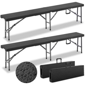 2 Pieces Set Folding Garden Bench Poly Rattan Design - Space-saving, robust & ideal for on the way! Robust: Robust and durable garden bench set »Malmö«. The seat benches have a powder coated steel frame. The easy-care surface is made from UV- and weather-resistant, high density poly ethylene (HDPE) rattan design. Foldable: Compared to conventional garden benches, these benches have a practical folding mechanism in the middle, so you can easily and quickly assemble the bench set. Car Boot Friendly: Thanks to the carry handles, its low weight and comapct size this camping bench fits almost in every car boot. Versatile: These easy-care folding benches are perfectly suitable for a cosy get together, a coffee break or just a quick snack. Also ideal for birthday parties, camping trips or barbecues. Floor protecting: The feet are equipped with non-slip pads to prevent scratches on sensitive underground. Therefore, you can also set them up inside. Product advantages: Indoor and outdoor