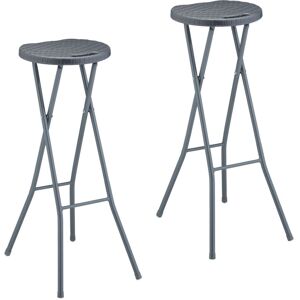 If you enjoy spending time in the garden, on the balcony or on the patio, these bar stools are for you. Sold in sets of 2, these bar stools are ideal for sitting in front of the bar or at a high table to relax and enjoy the summer. The grey rat pattern is a subtle eye-catcher and can be combined in many ways. And when not in use, the rattan stools can be folded away to save space. Barstool Set of 2 in Detail - Size H x W x D: approx. 80 x 34 x 45 cm - H x W x D folded: approx. 106 x 34 x 8 cm - Load capacity: approx. 120 kg each - Weight: approx. 2.4 kg each - Material: Plastic, steel - Colour: Grey Folding Counter Stools - Sturdy folding stools in a handy set of 2 - Modern design in grey rattan finish - Sturdy with metal legs and plastic seat - Folds up to save space - with handle for transport - Ideal for the garden, balcony, patio or veranda Included in Delivery - 2x bar stool - Decorative items not included