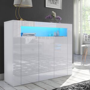 The item features a high gloss white finish to the front (including doors and front panels) with the rest of the body (top, sides and inside) in a matt white finish. The cabinet has three doors. Two doors use a push to open mechanism with a single shelf behind each, the middle cupboard door elevates slightly above the middle shelf for opening, with a glass shelf in the upper open space. White LED lights are included, they are mains powered with a UK power adapter. The foot switch is used to turn them on and off. Due to the nature of glass LED lights will have a green hue. Note that this is a flatpack item and will require assembly. Picture instructions, and a written notice are included with the item, these should be looked over carefully, before attempting assembly. Furneo