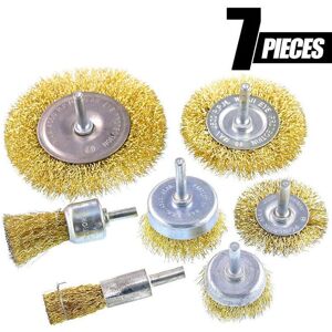 Set of 7 metal brushes for metal drill wood. Smooth shank 6 mm. Professional Set of brass wire brushes with 6 mm shank. The brass-coated corrugated steel brushes have a round shank (6 mm) The following brushes are included in the set: 4x disc brushes 38, 50, 75 and 100 mm 1x pot brush 75 mm 1x brush brush 25 mm 1x pipe brush 28 x 55 x 90 mm Versatile application options The wire brushes can be used for drills, cordless screwdrivers, as well as hand and stand drills. With this set, you can create surfaces from... Wood and wood-based materials Metal Non-ferrous metal Steel And many other materials ... safely remove rust, deburring, removal, grinding, and processing. Number of products: 7 pieces Color: Gold + Silver Size: