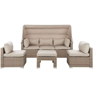 Outdoor Modular Set with Canopy. Enjoy sunny summer days with your family and friends on this marvellous modular garden lounge set that will elevate the look of every garden. The construction made of durable PE wicker gives it a natural look, and the metal inner frame guarantees stability. The set includes a multifunctional ottoman that can be effortlessly changed into a coffee table or an additional seat. Thick cushions ensure utmost seating comfort, and their removable covers can be easily washed. What is more, whenever you get tired of hot weather, just set up the canopy that will protect you from intense sun rays and wind. Details: Product Type: Lounge Set Style: Traditional General Color: Beige, Brown Shade: Light Brown Material Type: PE Rattan Main Material: PE Rattan Additional Material: Fabric Material Composition: 100% Polyester Shape: Rectangular Finish: Powder Coated Seat Foam Density: 24 kg/m3 Seats Up To: 5 People Dimensions: 3 Seater Sofa Dimensions: 213x76x146 Armchair
