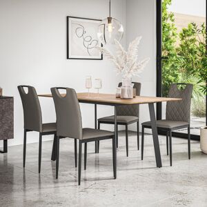 The Donni Dining Table is a beautifully crafted rectangle dining table with a timeless, minimalist design. The table boasts an elegant hardwearing, scratch resistant Black Oak effect table top that brings warmth and natural charm to any dining space, perfectly complemented by unique, sturdy, solid Black metal legs for a modern contrast. The Donni's simple yet sophisticated design makes it a versatile centrepiece, ideal for both casual meals and formal gatherings. The Donni Dining Table can seat 4-6 people, and yet its compact rectangle shape is perfect for maximizing space while creating an inviting and intimate dining experience. The Donni Dining Table is available in a range of tops (Grey, White Marble effect. Oak effect, and Black), with Black metal legs. With the Monza Dining Chair the Donni Dining Table will be the complete set. With a choice of Linen and Faux Leather in various colours, this sleek modern Dining Chair compliments the Donni Dining Table brilliantly. Available as a set of 4 or 6 with the Donni Table. Dimensions: Height: 75cm. Width:160cm. Depth: 180cm. Leg Depth: 75cm. Leg Width: 145cm. Chair Height: 92cm. Chair Width:45.5cm. Chair Depth: 58cm. Seat Depth: 43cm. Seat Width: 44cm. Seat Height: 46cm. Backrest Height: 50cm. Backrest Width: 35cm. Metro Lane Colour: White/Black/Beige