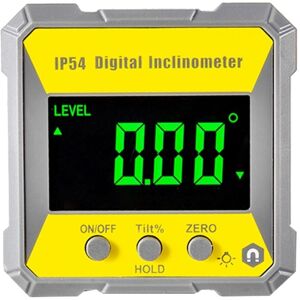 The LCD backlight digital display screen, backlighting allows you to see numbers in dark environments. With the IP54 waterproof and dustproof level, not easy to break or damaged, has a long service time. The magnetics design on one side can be adsorbed on the of metal objects and is not easy to slip off. Small size, easy to carry, with a storage bag for storage, you can put this inclinometer into your tool bags to carry. With the data hold function, more convenient to use, give you a better use experience. Battery:Two AA batteries(without battery) Colour:yellow Material:plastic Size:5.8 x 5.8cm Package Contents: 1 * Digital Inclinometer Only the above package content, other products are not included. Note: Light and different displays may cause the color of the item in the picture a little different from the real thing. The measurement allowed error is +/- 1-3cm.