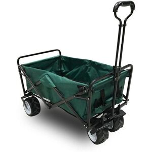 Folding, all terrain, heavy duty wheeled utility travel wagon in Green. Features solid rubber wheels, perfect for fields, the beach or mud! Water and stain resistant with washable inner surface Total size: L98cm x W55cm x H122cm Folded size: L77cm x W57cm x H26cm Outdoor chores can be made long and tedious without the right transportation. Forget awkward and unstable wheelbarrows, this folding garden wagon is a simple, innovative and space-efficient alternative. Featuring four all-terrain heavy duty wheels, this outdoor transport can tackle even the most uneven of ground, and stabilises itself. The fabric is hard-wearing and wipe clean, and can be expanded quickly and simply by pulling on the toggle to open and close. Available in Green with a solid and sturdy metal frame that would not buckle under weight. Capable of handling loads of up to an impressive 68kg, the outdoor trolley has been designed to fold conveniently down into a flatter, easy to store form, which is great if you