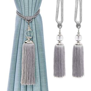 [Size] -- Total length: 60cm; Tassel length: 18cm, the diameter of the crystal ball is 5cm. Our tassel curtain tiebacks belong to the grand style. -------PLEASE note the size of the tiebacks before ordering. [Durable Quality] -- Tassel curtain tiebacks, hand-woven from shiny polyester material, professional manufacturing process tassels and high-quality hand-woven braided rope design, strong and not easy to wear or pilling. [Suitable for All Curtains] -- The silver curtain tiebacks are perfect for sheer curtains, heavy or thick blackout curtains, not easy to fall off. Anywhere indoor and outdoor curtain tiebacks like living rooms, bedrooms, bathrooms, dining rooms, offices and studios. [Great Home Decoration] -- Curtain tiebacks for curtains, can be used as curtain tiebacks, door hangers, wall hangers and other various purposes. The curtain tieback hooks can not only be curtain holders for wall, but also perfect decoration as Christmas curtain tiebacks / farmhouse curtain tiebacks /