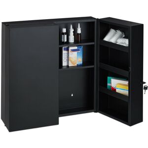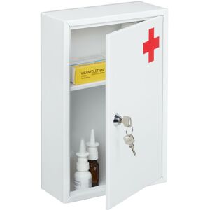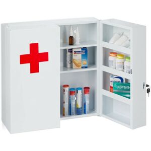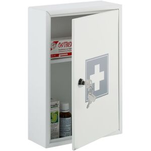 Store medicines, dressing materials as well as first aid kits within easy reach in this large medicine cabinet. The angular medicine cupboard offers plenty of storage space in its 2 compartments. Important and sometimes dangerous medicines are protected from curious children and unauthorised persons thanks to the lockable doors. Hang the white first-aid cabinet with red cross on the wall in the bathroom, kitchen or doctor's office using the enclosed mounting material. Medicine Cabinet in Detail - Dimensions H x W x D: approx. 32 x 21.5 x 8 cm - Size of top compartment H x W x D: approx. 10 x 18 x 7 cm - Size of bottom compartment H x W x D: approx. 18 x 18 x 7.5 cm - Max. load: approx. 5 kg - Weight: approx. 1.3 kg - Material: Iron - Colour: White, red Practical Wall Mounted Medicine Cupboard - Sturdy metal medicine cabinet in white with red cross - 2 compartments for medication, plasters and more - Perfect for at home, in the office or public spaces - With 2 keys for childproof