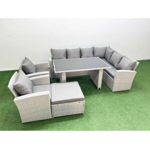 This classic corner sofa can accommodate 7 peoples and has a comfortable and soft cushion back, made of new premium dark grey rattan that will withstand British weather. Pls kindly leave your mobile number at checkout for not delaying your shipment . Set dimensions: •1 x 3 Seater sofa with two arm : 170L x 69W x 79H cm •1 x 3 Seater sofa with single arm: 160L x 69W x 79H cm •1 x Oblong Black Tempered Glass Dining Table : 140L x 80W x 70H cm •1 x Big Footstool :65L x 65W x 34H cm •2 x Chair: 74W x 69D x 79H cm Light Grey Mixed rattan with dark grey fabric .Color may vary due to light or monitor .we are unable to return the item due to this problem .Please consult before purchase if you have requirment on color saturation. Items Comes Flat Packed And Easy to Assemble,Sturdy Galvanized Steel Tube Metal Frames With Powder Coating To Prevent Rust.Ergonomic High Back And Declining Design For Extra Comfort. Flat PE Rattan Completely Made By Hand, 5mm Thick transparent Tempered Glass With