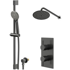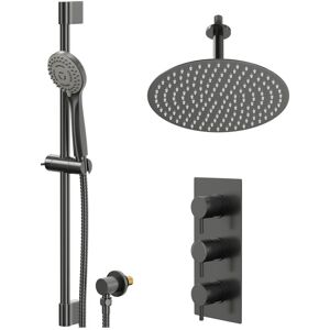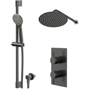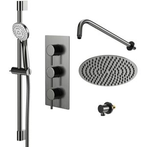 Model Number: WDB77237 For the ultimate luxurious showering experience and effortless good look, choose our Colore Round Gunmetal Grey Concealed Triple Thermostatic Shower Valve Including 300mm Fixed Shower Head with Wall Arm and Slide Rail Kit. Included, you'll receive a concealed thermostatic shower valve with three round controls to control the 2 outlets, a wall-mounted ultra-thin round shower head with an arm, and a practical slide rail kit. This gives you the flexibility to use either the shower head or the handset to wash your body without getting your hair wet. All elements are finished with a modern gunmetal grey finish that is sure to add a chic touch to your bathroom, while the units stainless steel construction protects it from corrosion and extends its durability. Key features Round concealed shower valve Round shower head with wall arm Durable brass & stainless steel construction Modern gunmetal grey finish Thermostatic controls for precise temperature adjustments