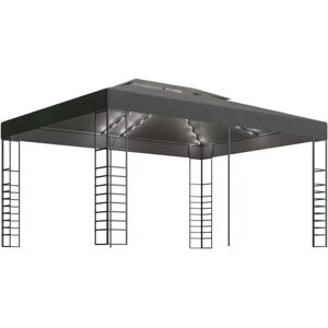 This spacious gazebo will make an elegant addition to your outdoor living space while keeping your family and guests cool and shaded on sunny days. The vented canopy will keep the sun and rain from spoiling the fun at family gatherings, barbecues, afternoon picnics, and birthday parties. The party tent has a sturdy steel construction with decorative square details and a 100% polyester roof. This product is easy to assemble. Additionally, the string light creates a cosy atmosphere in your garden when the sun goes down. The lights bring no pollutions to the environment as it is charged by solar energy during the day. Note: The gazebo has not been designed as a permanent structure and it is not recommended to use it in extreme weather conditions. Gazebo colour: Anthracite Light colour: Warm white Material: Fabric with PA coating(100% polyester), steel Dimensions: 3 x 4 x 2.7 m (L x W x H) Eave height: 2 m Frame with decorative square details Length of each string: 3 m Number of LEDs: 43