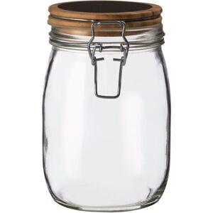 The jar is made from clear glass and is ideal for storing a variety of dried foods. A black chalkboard label on the front adds to the vintage design and adds to its versatility. The lid is made from solid wood and has a light brown colour with a bold grain.
