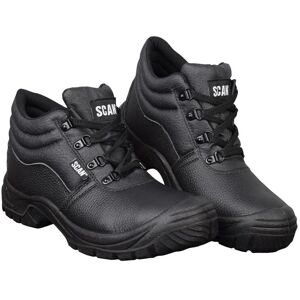 1 x Pair of Scan 4 D-Ring Chukka Black Safety Boots UK 7 EUR 41 The Scan Chukka Safety Boots have grained leather uppers offering excellent resistance against abrasion. With anti-static, energy absorbent polyurethane soles for comfort, strength and durability. The padded ankle collars provide additional comfort whilst the 200 Joule steel toecaps and midsole provide protection. The soles are resistant to oil, acid, alkaline, heat (180°C) and penetration. Conforms to EN ISO 20345 standard. Safety Rating: S1P. Slip Rating: SRC.