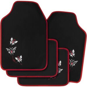 Car floor mats made of Carpet set of 4 piece, 2 front mats and 2 rear mats Front Mats: 66x43cm; Rear Mats£º 41x30cm; Colour: Black with Red Embroidery Butterfly Attractive design and universal sizes, suitable for almost all standard vehicles Enhances the look of your cars interior at low costs Please check the dimensions of our mats with the dimensions of your original mats before buying Product Description Woltu car mats Features of Woltu's universal car mats: Set of 4 piecesThick carpet material for extra comfortCan trap water, sand, dirt, snow etc.With a non-slip designFor all seasons and weather conditions Non-slip design Under the mats there are non-slip balls that prevent slipping, so that the car mats can fit better and protect the car trim. Embroidered designs Featuring an elegant butterfly embroidery, the universal car mat set features a modern and stylish look to renew and make your car interior more personalized. Designed with edging Edging can help trap dirt and water to