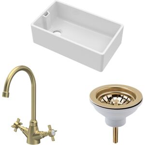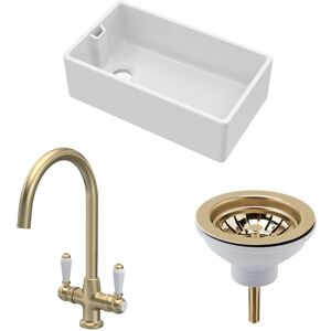 Fireclay Kitchen Bundle - 1 Bowl Butler Sink, Waste & Bridge Lever Mixer Tap - 795mm - Brushed Brass Bring balance and beauty into your kitchen with the Balterley Bundle - a handcrafted Butler sink with brushed brass bridge lever tap and waste for a refined farmhouse finish.. Spacious single bowl, perfect for compact kitchens with style. The Butler sink, handmade by Master Potters in durable fireclay, provides a smooth, non-porous glaze and generous capacity. A brushed brass bridge tap with lever handles adds effortless flow control and a striking focal point. Combined with the matching waste, this bundle enhances both function and style. Product Highlights: Style: Fits perfectly with a range of kitchen styles, blending traditional charm with modern elegance. From cosy, vintage kitchens to sleek, modern spaces, its versatile design brings a touch of class to your kitchen. Fireclay craftsmanship: Sink handmade using traditional methods by Master Potters, offering strength,