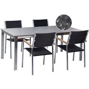 Rectangular Outdoor Table with Set of PE Rattan Chair. Prepare your garden for the season and transform that space into a stylish meeting and dining space for you and your closest ones. Crafted out of stainless steel, and with a tempered glass top in timeless black colour, the table boasts natural UV, water and rust resistance, making it the perfect choice for a variety of modern outdoor settings. The large tabletop offers enough space for up to 6 people, so throwing larger parties with this set will be easy. Included chairs, with PE rattan backs and seats in matching colours, will reinforce the contemporary look, while also offering a comfortable place to sit and eat favourite meals. Details: Product Type: Dining Set Style: Traditional General Color: Black, Silver Material Type: Glass Main Material: Tempered Glass Additional Material: Plastic Wood Top Material: Glass Finish: Brushed Seats Up To: 4 People Dimensions: Chair Dimensions: 55x58x87 cm Seat Height: 44 cm Table Dimensions: