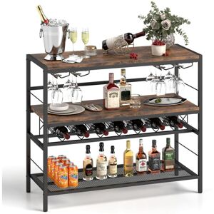 This modern wine bar table offers a wide countertop for housing kitchen appliances, tableware, and decorative plants, along with 4 glass holders to elegantly display your stemware. Moreover, the middle storage shelf and wine racks provide additional space for your wine collection, while the bottom grid shelf is perfect for larger items. Crafted with a high-quality metal frame and thickened board, it is both durable and resistant to deformation. Safety is ensured with adjustable foot pads, an anti-falling bar, and an anti-falling device that can secure the table to the wall. This wine bar table measures 104 x 40 x 87 cm (L x W x H), making it a space-saving option for small rooms. Hence, this wine table is suitable for various scenarios, and can be a centerpiece in your kitchen, living room, dining room, or as a bar in social settings. Ample Storage Space : Equipped with a wide countertop, this cabinet holds kitchen appliances, tableware, and decorative plants easily. The 4 stemware
