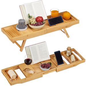 This extendible bamboo bathtub caddy is not just an ideal tool to make your bath even more relaxing and comfortable. It can also be used as a serving tray. All you have to do is fold out the legs. Adjustable compartments and various holders help you to have bath accessories, your phone, drinks or snack conveniently in reach. A book stand makes sure you can lean back and enjoy a good book or watch a movie on your tablet to pass the time. 2in1 Bathtub Caddy & Serving Tray Details - H x W x D: app. 5 - 18 x 74.5 cm - 114 x 25 cm - Materials: MDF, metal, polyester - Weight: app. 2.5 kg - Maximum capacity: app. 6 kg - Look: Natural Dimensions - Book stand H x W x D: app. 17.5 x 23.5 x 0.5 cm - Size per compartment: H x W x D: app. 2.5 x 9 x 20.5 cm - Cup holder diameter: app. 8.5 cm - Wine glass holder W x D: app. 6.5 cm - Smartphone holder W x D: app. 10 x 1.5 cm Adjustable Bathtub Caddy - Extendable bridge for all standard bathtubs - Folding support for books or tablets - Adjustable