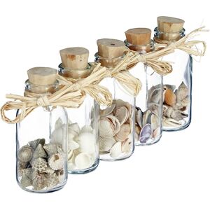 Shells do not merely spread a holiday flair, but also help quench that wanderlust of yours. These 5 small glass bottles are filled with various kinds of seashells and sealed with wooden plugs. You can set these bottles up all over your flat or use them as a lovely ensemble. These seaside inspired glasses with a colourful seashell mix can be a stylish addition to your home! Mini Glass Bottles Details - H x Diameter: app. 12 x 4.5 cm - Weight per bottle: app. 110 g - Material: Natural shells, glass, wood - Colour: Transparent, natural Shell Mix in Bottles - Shell set as maritime decor - Home accessory for bathroom, table,windowsill - Contents sorted by shell type - Small glass bottled message - Great gift for friends and family Included in Delivery - 5 x Seashell Bottle - Additional decorations are not included