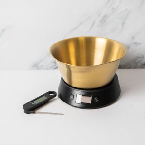 Scales weight dry ingredients up to 5kg/11lbs and wet ingredients up to 5L/9 pints. Weighs dry and wet ingredients LCD panel with unit selector, tare function and battery life indicator. Scales require 1 battery (included) Thermometer has an easy-to-read printed dial with ideal core cooking temperatures for different meats Thermometer displays temperatures from 54-88c / 150-190f Five-Year Guarantee (scales and thermometer)