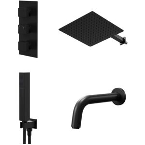 Model Number: WDB79235 Key features Set your perfect temperature and adjust the water flow to your fixed showerhead and adjustable handset independantly The concealed valve fits flush Rain effect overhead shower rose Stunning matte black finish Comprising of: Matte Black Square Slide Rail Kit Matte Black Deluxe Square Shower Elbow Matte Black 200mm x 200mm Thin Square Shower Head Matte Black 345mm Square Fixed Shower Arm