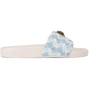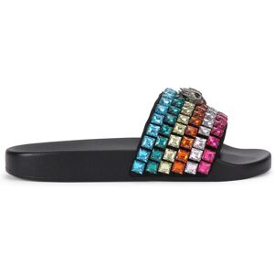 This Carvela Meena Eagle sandal slips onto the foot with a black moulded footbed. The toe strap is designed in the rainbow Kensington weave with Kurt Geiger London branding on a crystal coated canvas. There is an antiqued silver eagle head sat on top.