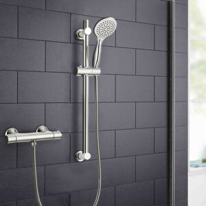 This solid brass round thermostatic exposed shower mixer is a sleek and modern design and a cost effective showering solution. This shower set is fully thermostatically controlled, with Separate Flow and Temperature controls allowing you to tailor the shower to your preference. The left diverter controls the water the water on/off and the water flow and the diverter on the right controls the temperature which has a safety stop preset as a set temperature of 38 degrees C. for comfort and safety. The slider rail also comes with an adjustable bracket for the handheld shower allowing you to change the angle of the the handset and move it up and down to suit your preference. 10 year guarantee against manufacturing faults Features This Sleek Modern Designed Shower is sure to fit into any Bathroom Fully Thermostatically Controlled Separate Flow and Temperature Controls Suitable for High and Low Pressure Systems Durable and solid brass construction - Exceptional build quality and finishRound
