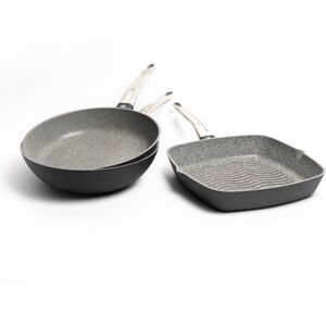 SAUT, GRILL AND STIR FRY WITH CONFIDENCE: cook speedier, healthier meals with these revolutionary pans ROBUST CAST ALUMINIUM BODY: heats quickly and evenly, so you get that real stir-fry 'sizzle' EXTRA-TOUGH NON-STICK: this easy-clean, double-layer, speckled finish provides the best results each time HEALTHIER, EASIER COOKING: cook with less oil, and toss your ingredients against its high sides USEFUL INFO: suitable for all hobs, including induction. Dishwasher safe. Twenty five year guarantee Dimensions: Wok 28cm x 49cm x 11.5cm Frying Pan 28cm x 48.5cm x 9.5cm Griddle Pan 51cm x 27.8cm x 2cm