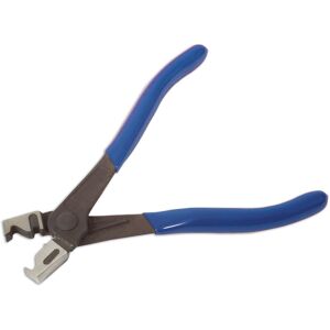 Specially designed hose clip pliers for releasing and refitting reusable hose clips. Useful for accessing reusable Clic/Clic R type hose clamps in normally inaccessible positions. Special profile jaws securely grip hose clamp. Length: 177mm. Manufactured from Chrome Molybdenum, with a soft grip handle.