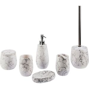 Assorted Bathroom Accessories. Keep the fashionable look in your bathroom with this 6-piece assorted accessories set. It has everything that you may need, from a soap dispenser to a toilet brush. Store your cosmetics and accessories in stylish containers and forget about the clutter in the interior. All parts are made from dolomite with a stylish terrazzo-like design that will bring a touch of elegance to every bathroom. Details: Product Type: Bathroom Accessories Set Style: Modern General Color: White, Black, Red Shade: Off-White Material Type: Ceramic Main Material: Dolomite Ceramic Additional Material: Synthetic Material Finish: Matt Dimensions: Depth: 11 cm Width: 13 cm Height: 20 cm Overall Dimensions: 13x11x20 Weight: 1 kg Offer Includes: 1 x Container, 1 x Toilet Brush, 1 x Soap Dispenser, 1 x Tumbler, 1 x Toothbrush Holder, 1 x Soap Dish Key Features: Decorative Yet Functional, Elegant Design, High Quality, Easy Care and Durable Materials Assembly Information: Does Not Require