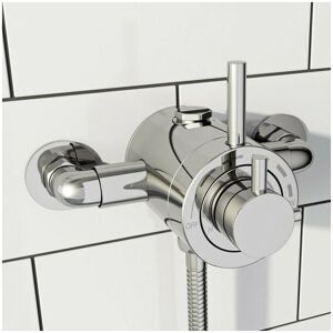 Features and Benefits: Contemporary Style Exposed version. Adjustable pipe centres of 135mm - 150mm Ideal Replacement Valve 1/2"" BSP Outlet Suitable for top and bottom outlet - for shower hose or rigid riser rail. Elbows rotate to allow pipework to come into the valve from up or down the wall Simple to use manual concentric valve. Thermostatic controls make it safe to use for all the family. 15mm compression fitting & brass wall plate Hot and cold water indicators. Strong brass body finished in a stunning chrome for long lasting functionality and attractiveness