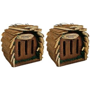 These rustic style butterfly houses are ideal for attracting these beautiful fluttering insects to your garden. Made from rustic wood, they feature a natural bark roof outer and slotted holes in the front as entrance ways. Suitable for hanging from a tree or up on a garden wall, the house includes a sturdy metal hanging hook which is naturally aged. The ideal height is between 4 and 6 feet in a sunny but sheltered spot. Placement near nectar-rich flowers is encouraged, which will provide residents with a food source. These butterfly houses look good in any garden setting and make the perfect gift for gardeners and nature-lovers wanting to encourage more diversity into their gardens. * Measures L 15cm x W 16cm x H 16cm * Rustic style butterfly habitat * Crafted from natural wood * Set of 2